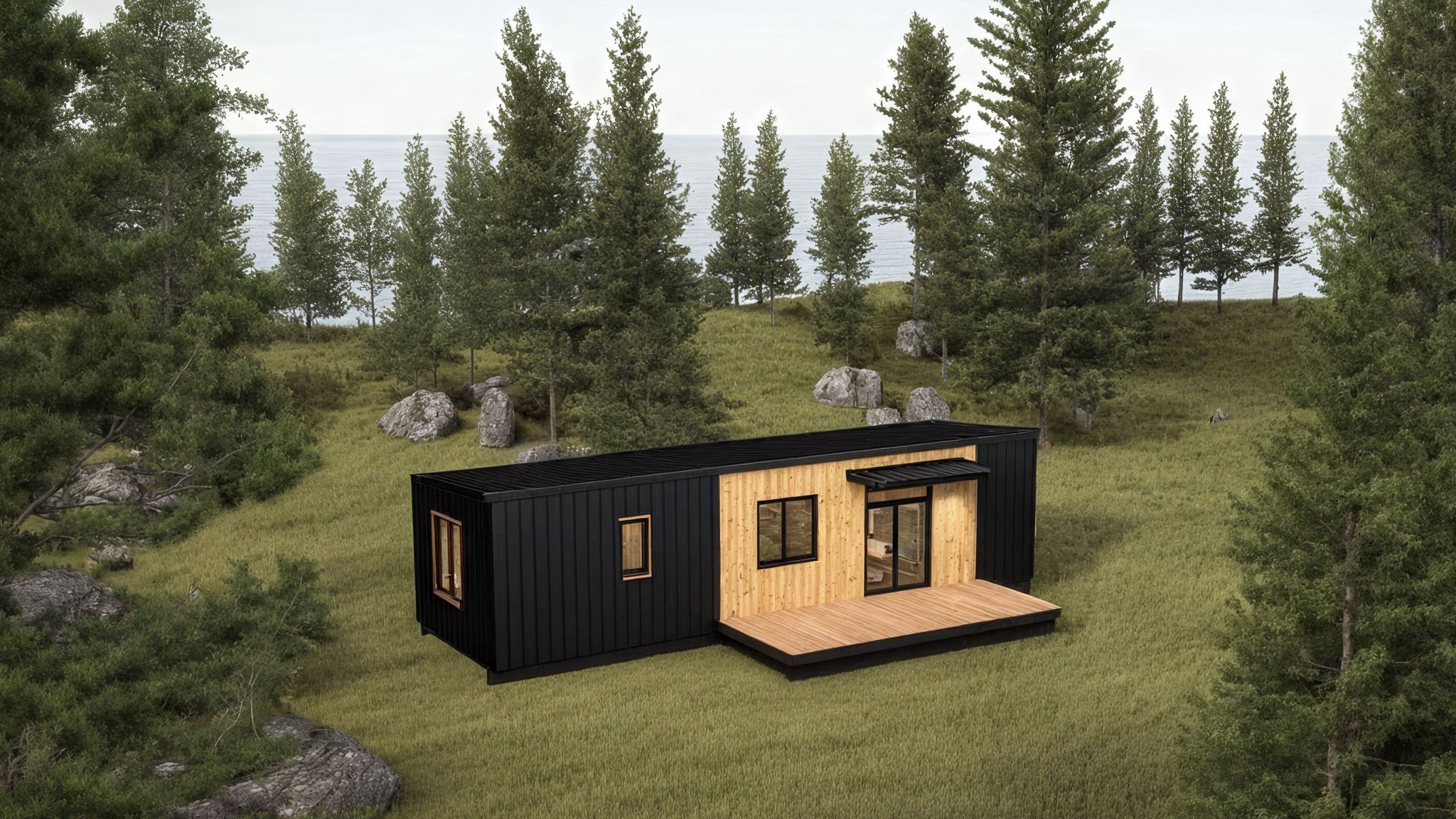 The bold black standing seam siding and warm wood accents create a striking exterior, while the expansive front deck invites you to slow down and enjoy the outdoors.