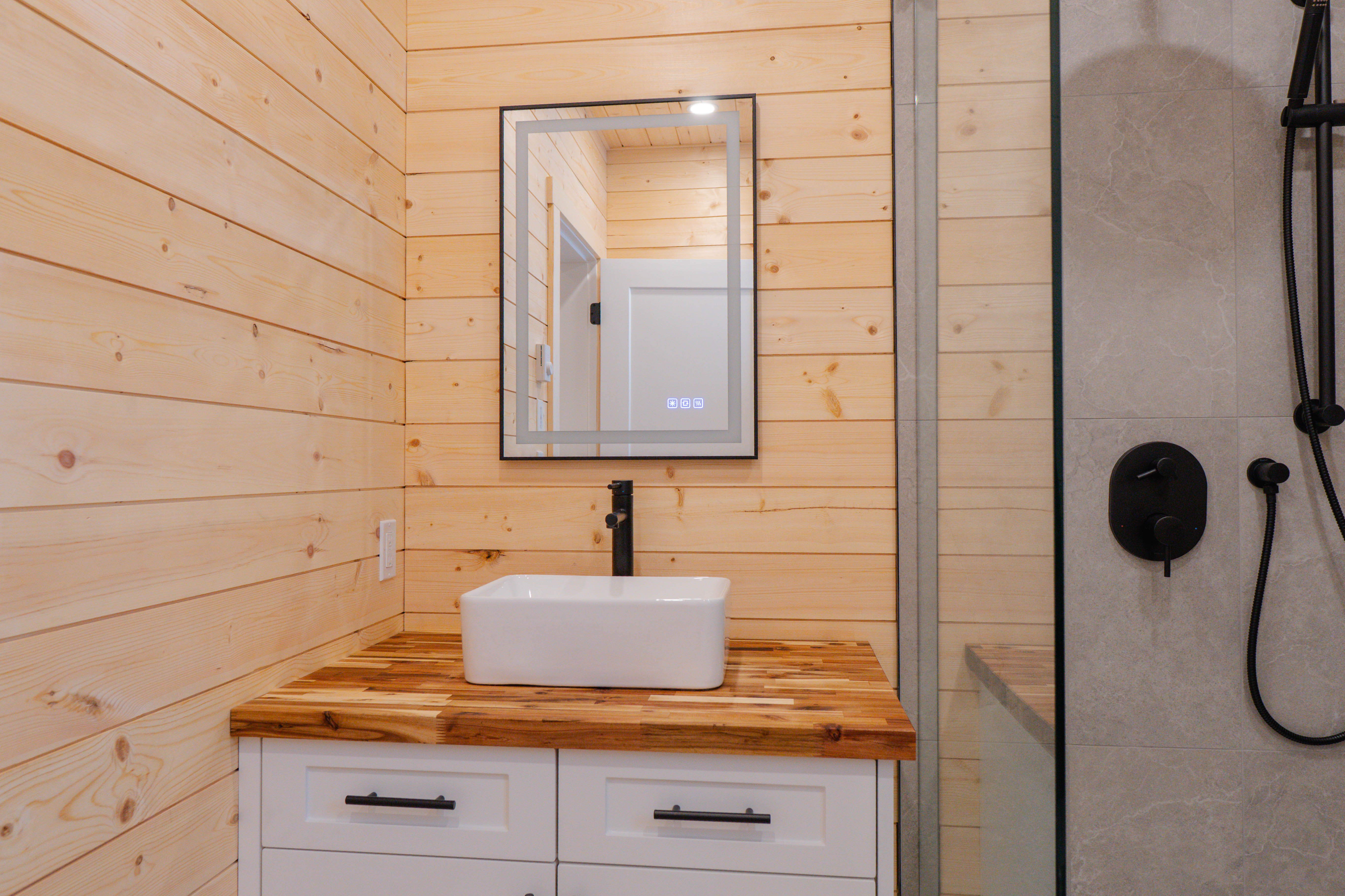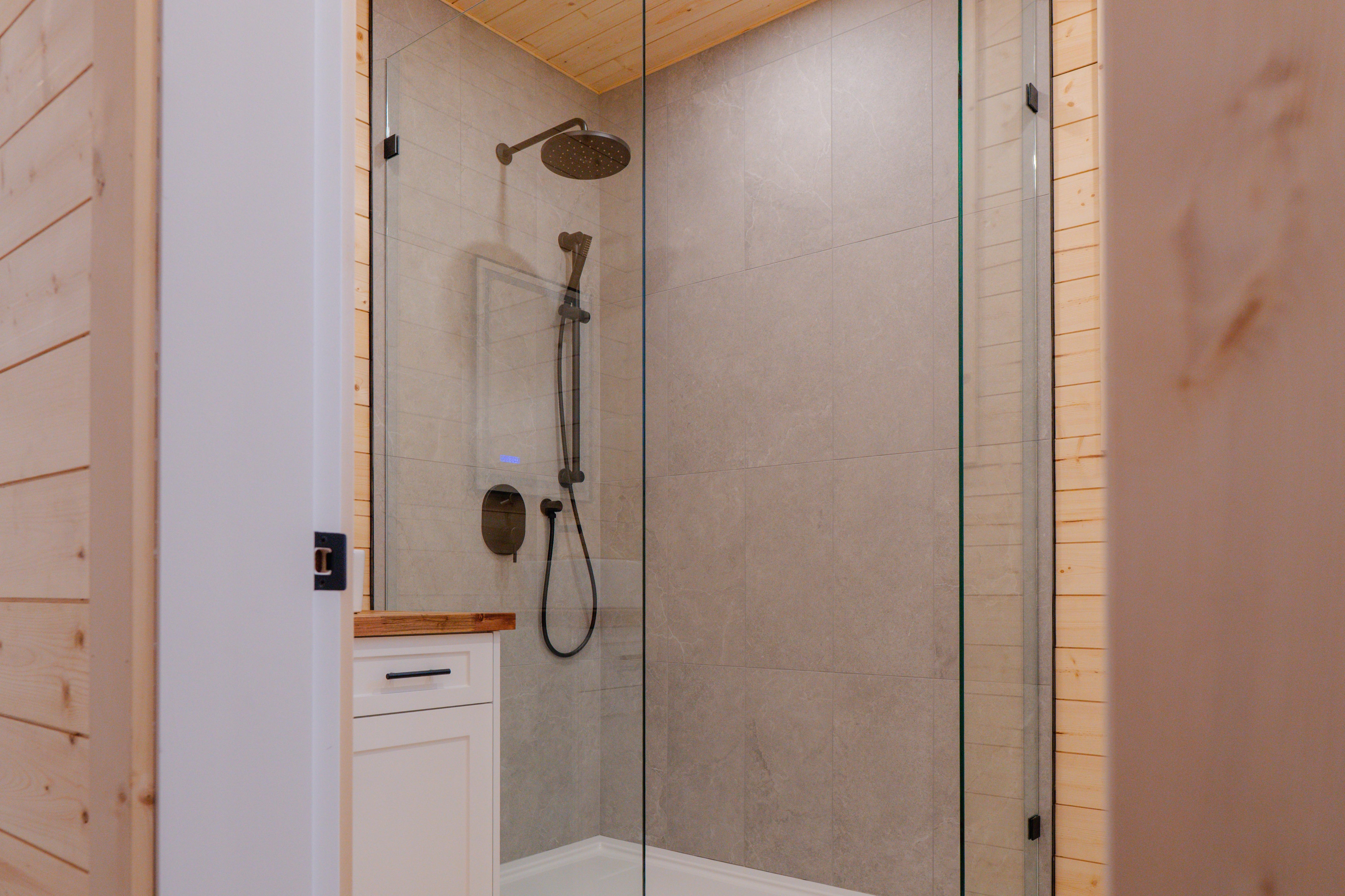 🚿 Stylish Bathroom – A walk-in shower with stone-textured tiling, modern fixtures, and a sleek vanity provide spa-like comfort.