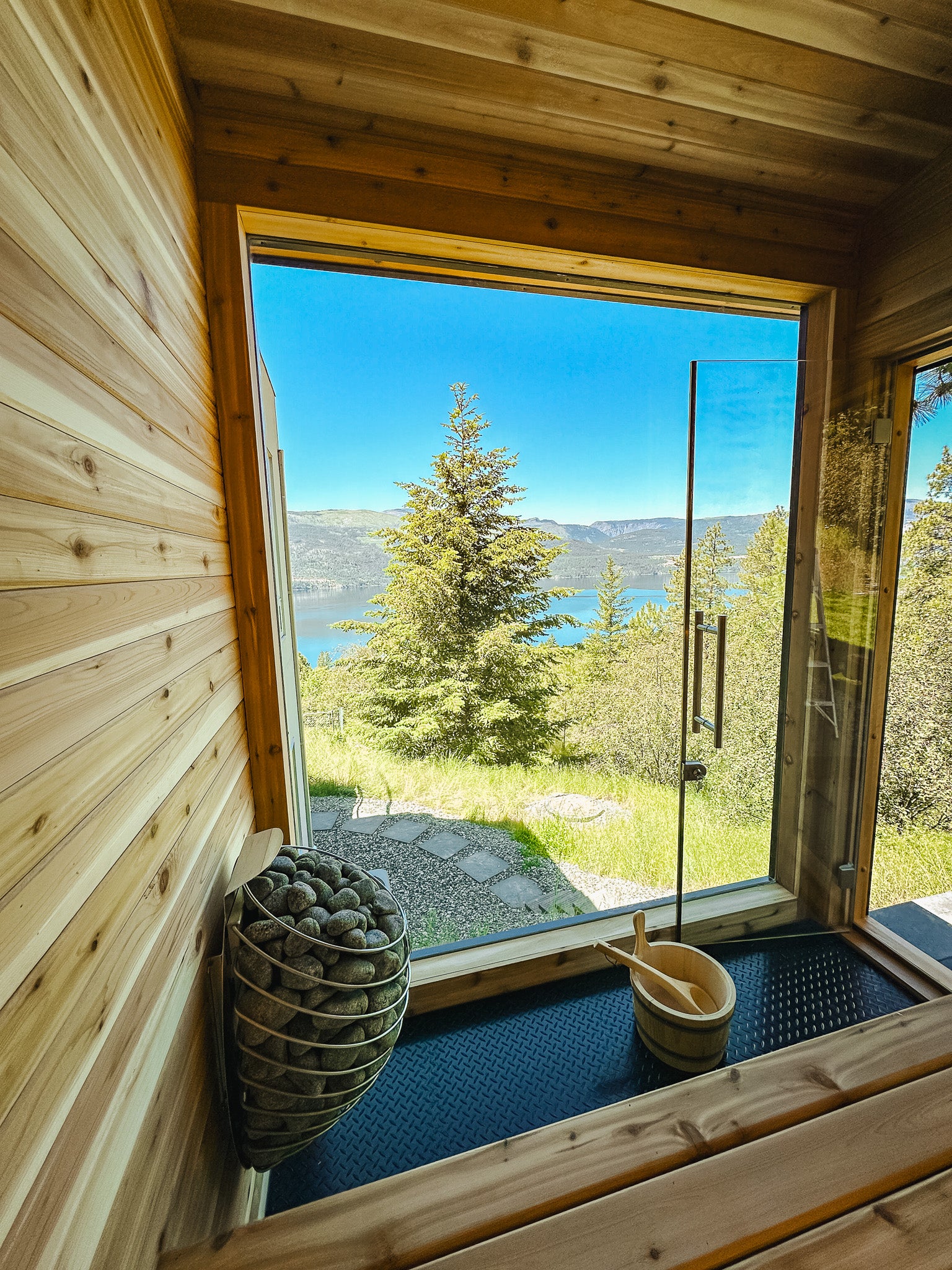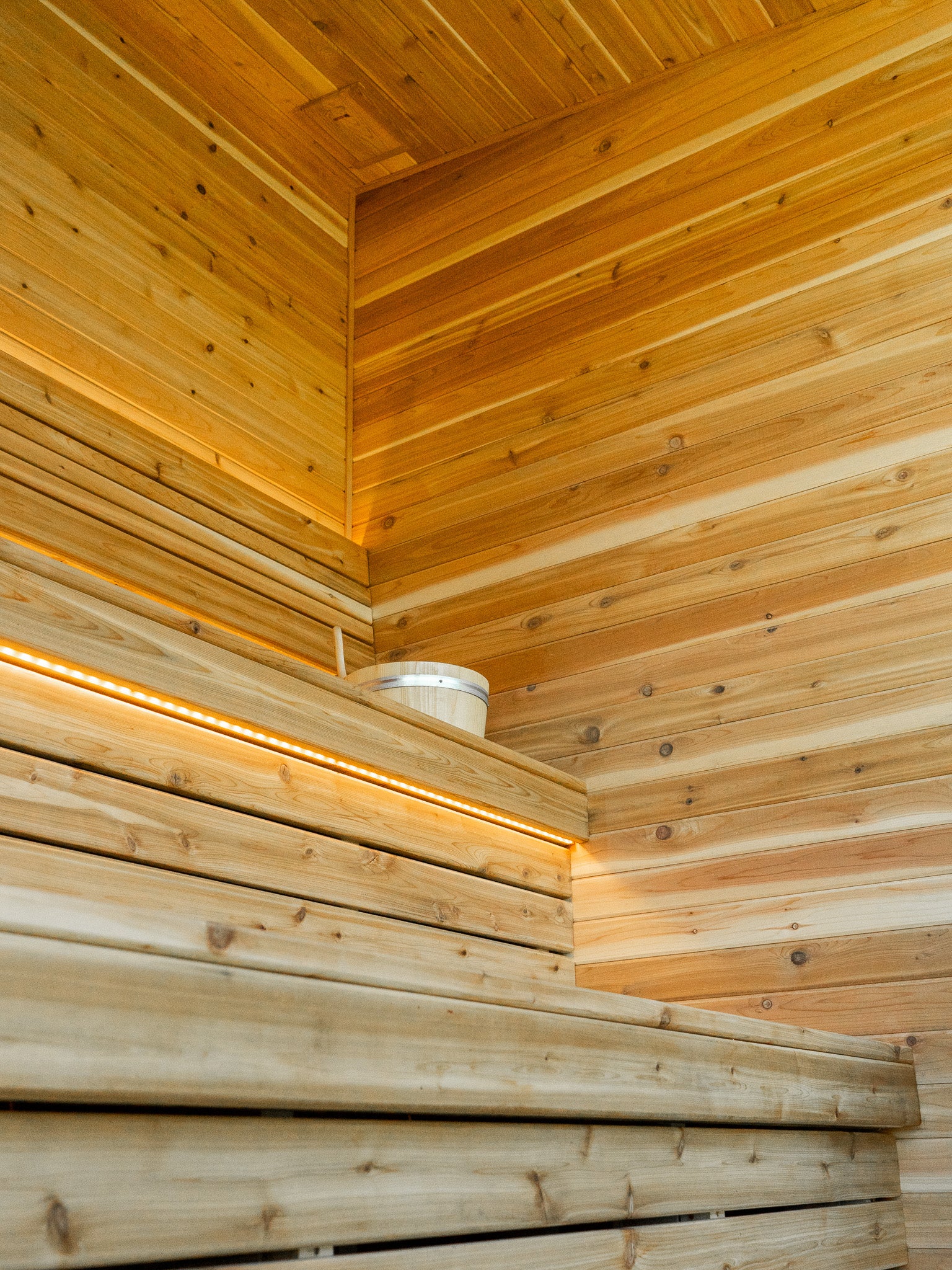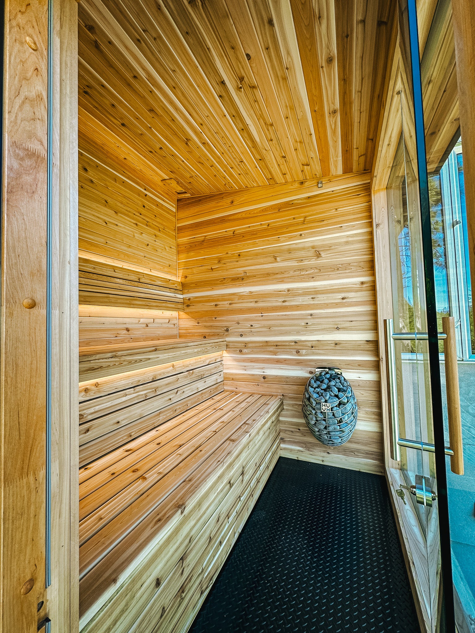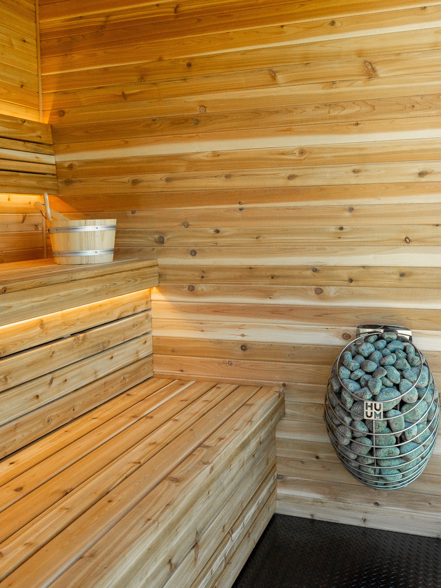 The sauna comes standard with a HUUM Electric Heater or HUUM Woodstove, Knotty cedar inside and out, and a floor-to-ceiling viewing window.