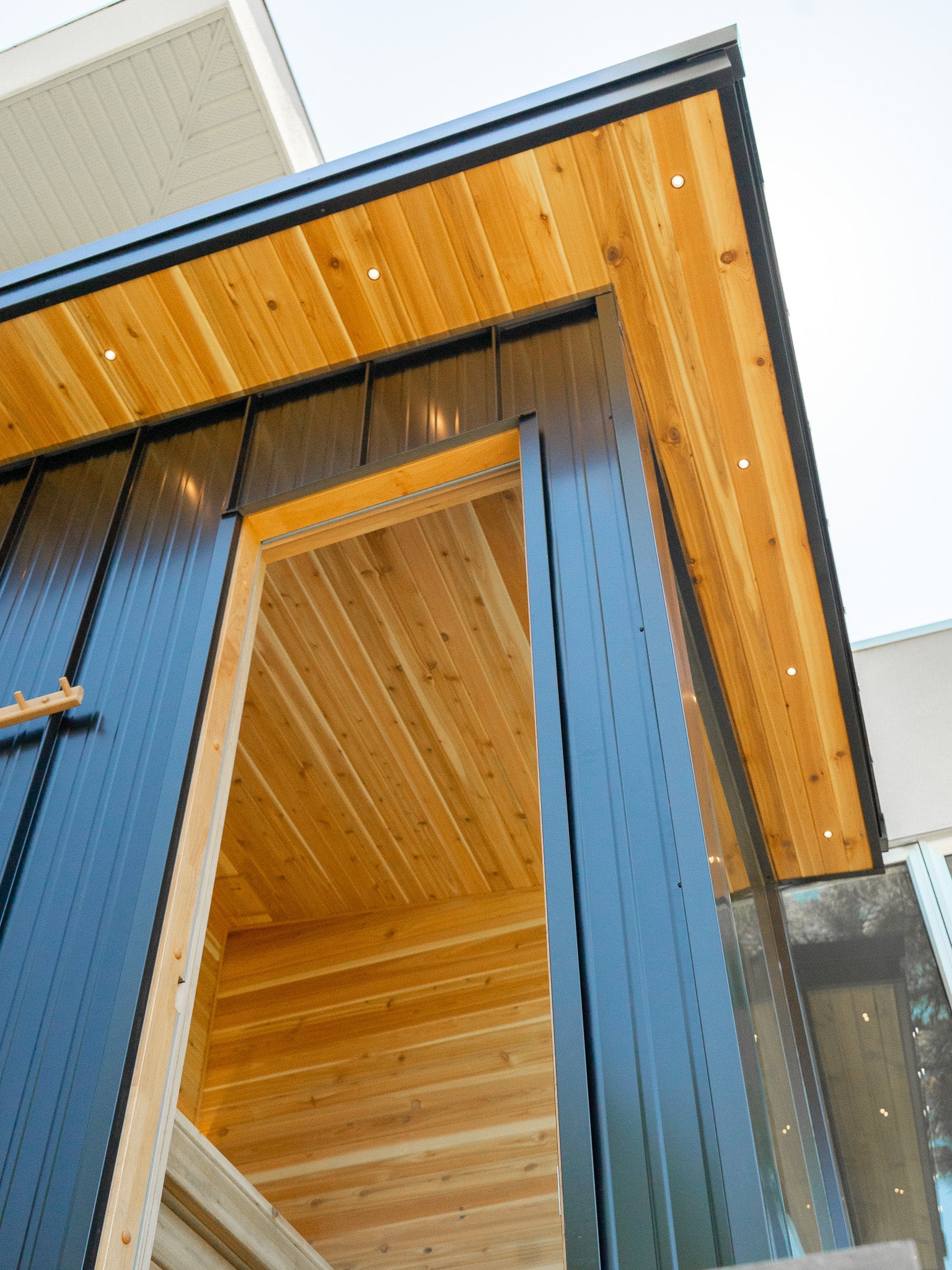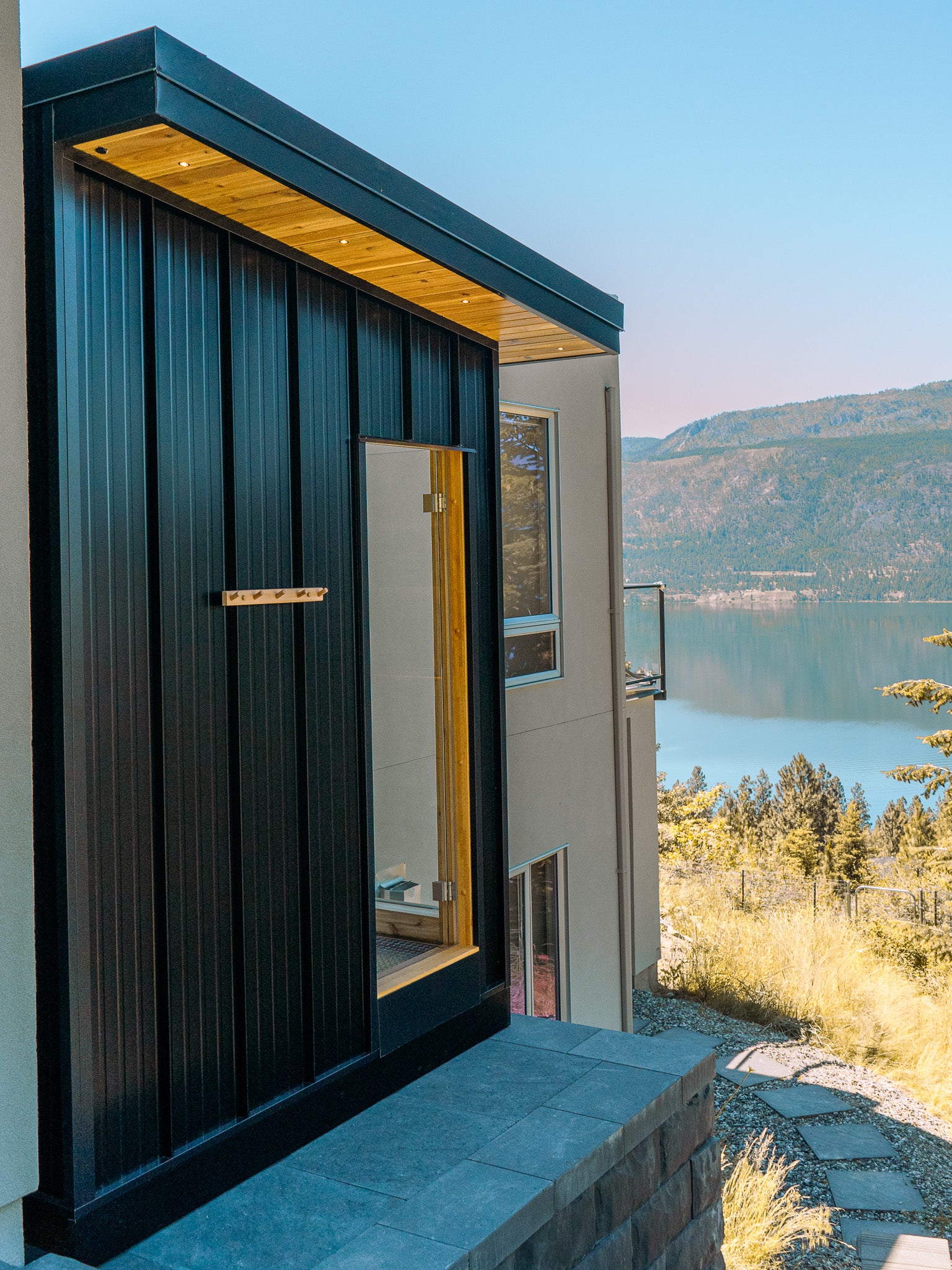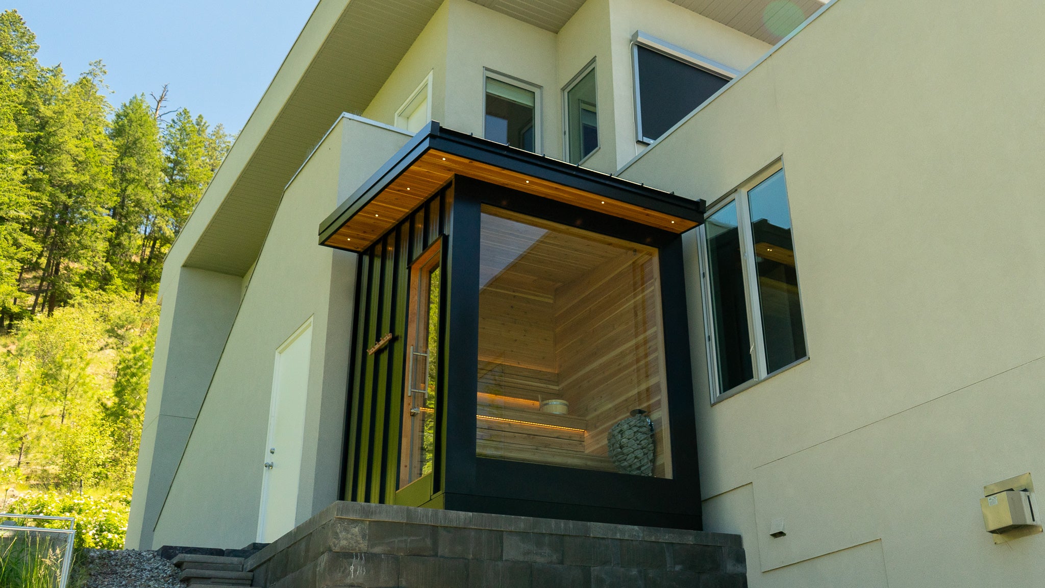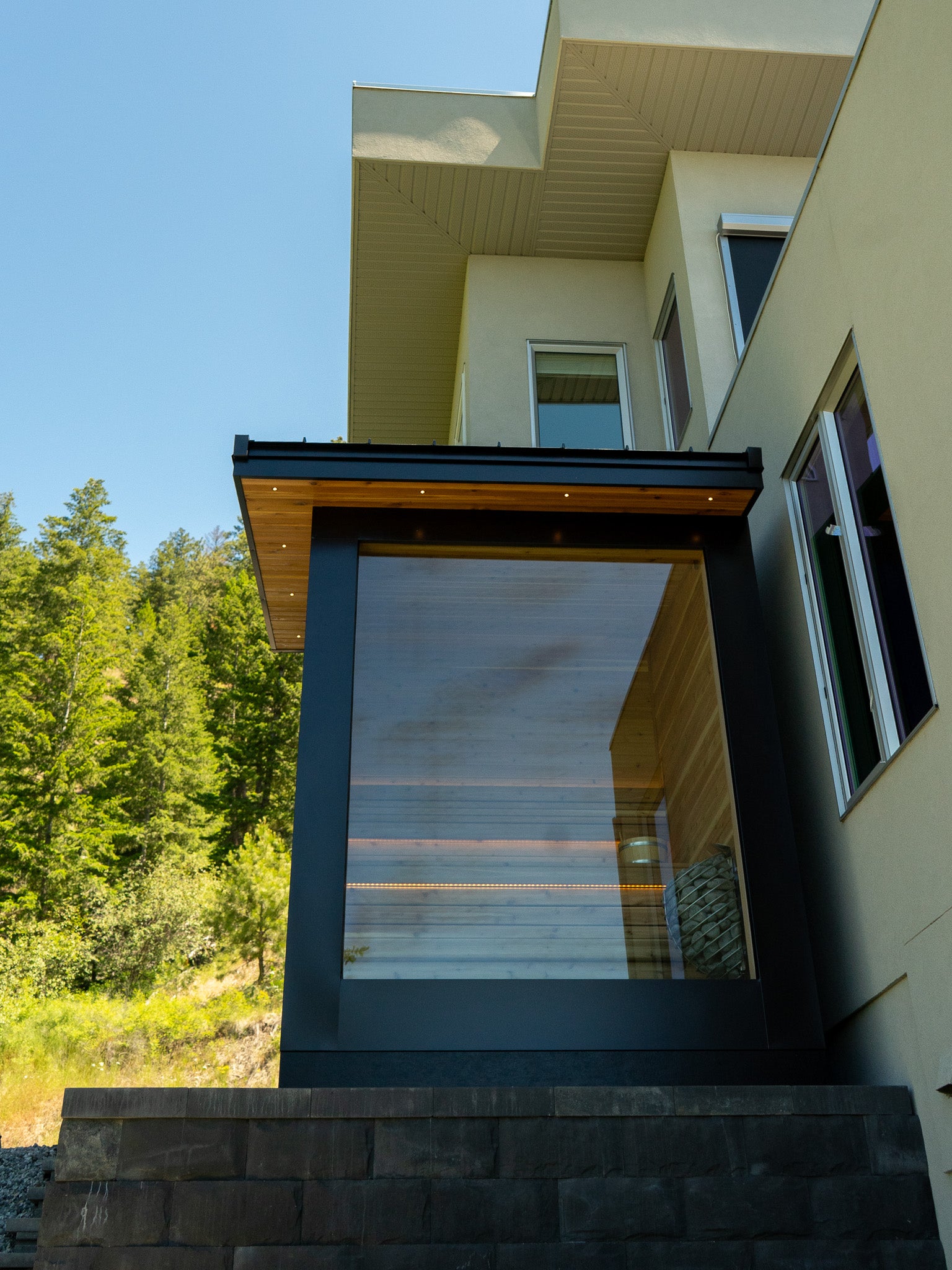 The sauna comes standard with a HUUM Electric Heater or HUUM Woodstove, Knotty cedar inside and out, and a floor-to-ceiling viewing window.