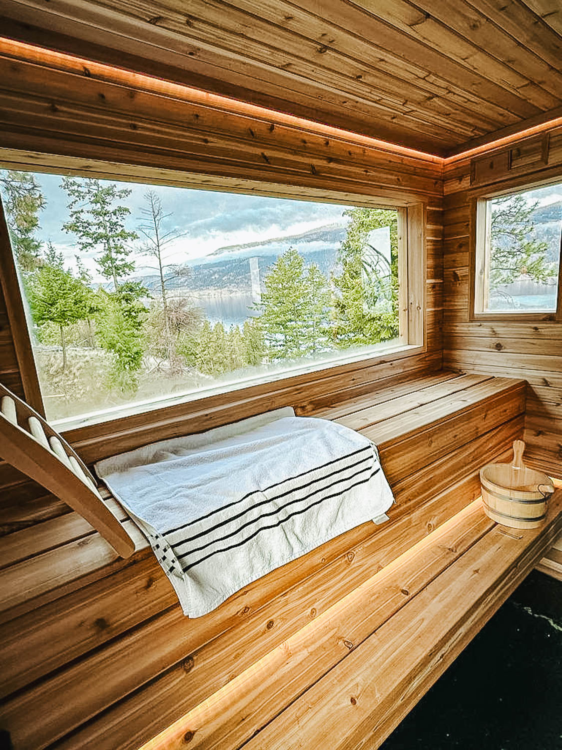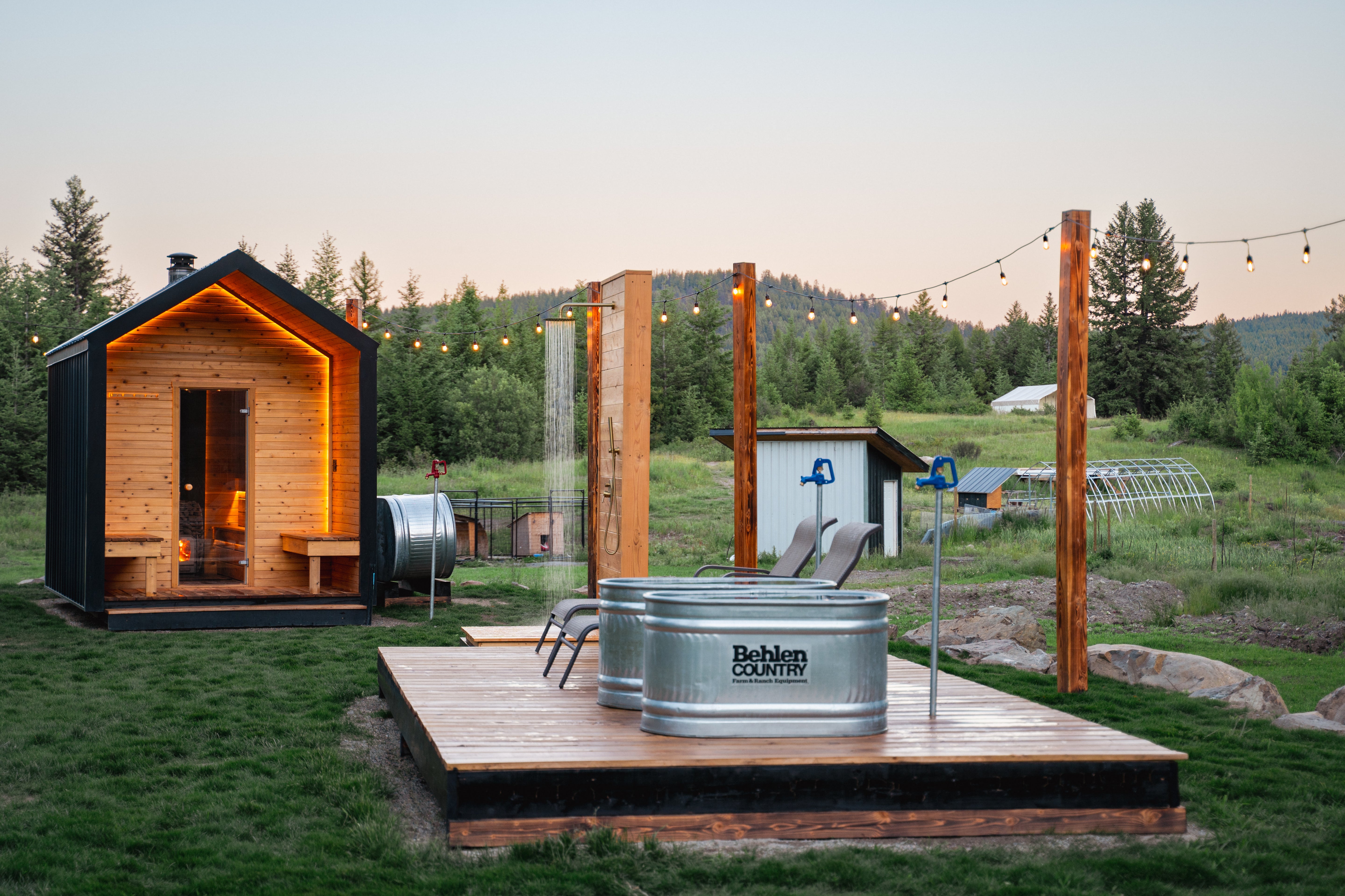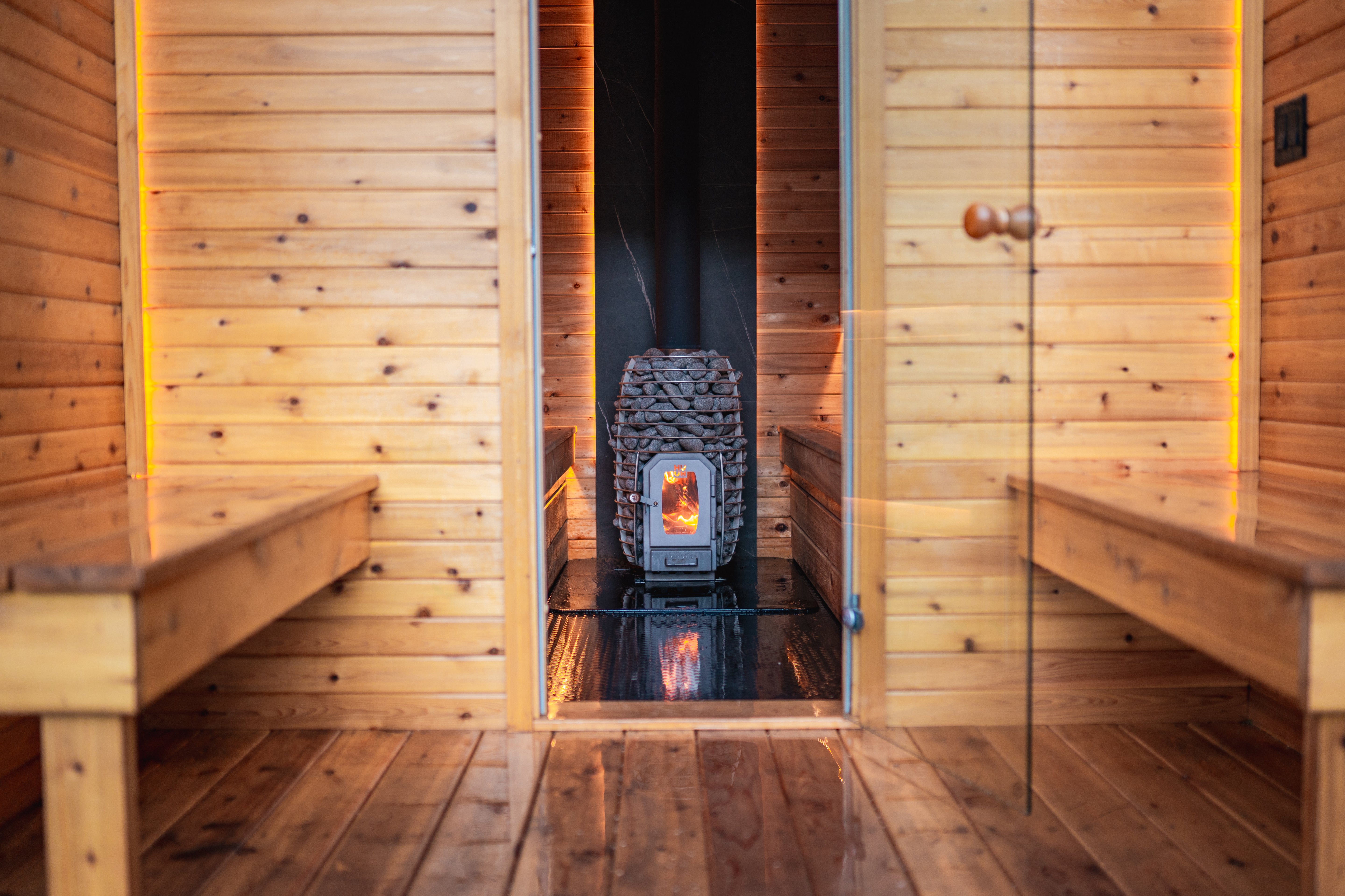The sauna comes standard with a HUUM Drop 9kw Heater or HUUM Hive 13 Woodstove, Tight Knot Western Red Cedar inside and out, and black metal siding and roofing.